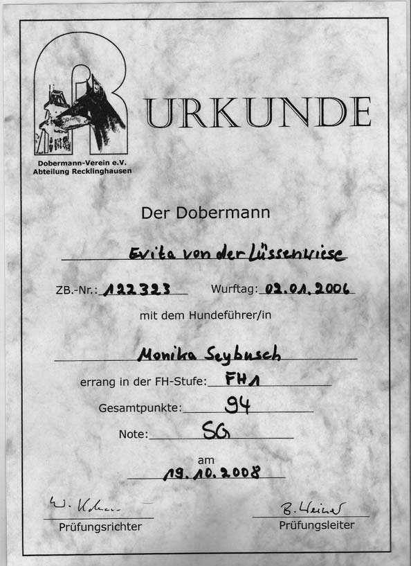 | 15.11.2008 | DVG Marl-Sickingmühle | Prüfung | FH2 (82 Punkte) |